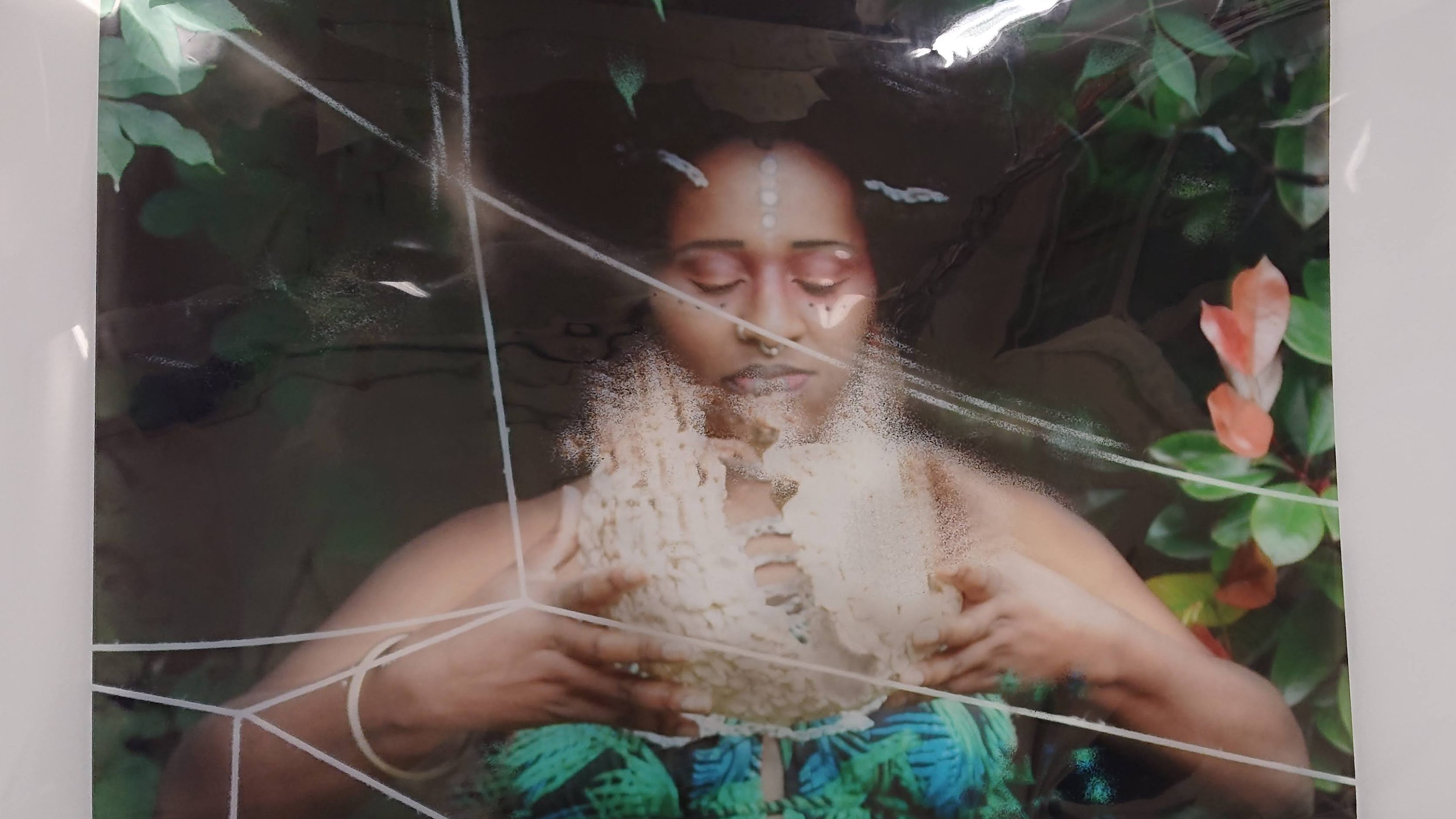 Image: Joanne Lasmin White. Anansi (2020). Photograph featuring a model with ceramic crochet vessel and necklace behind silk string silk.